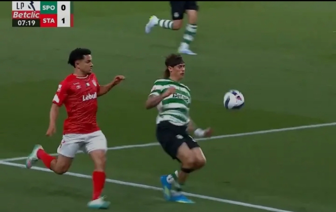 O Santa Clara ainda vencia, por 1-0, em Alvalade quando este lance junto da área do Sporting gerou protestos do Santa Clara