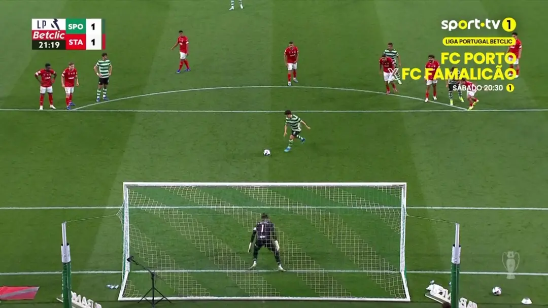 Minuto 20: penálti para o Sporting por derrube de Romão a Geny Catamo! Minuto 22: marca o Sporting! Pedro Gonçalves faz o 1-1 de grande penalidade. Guarda-redes para um lado e bola para o outro.
